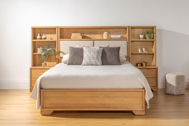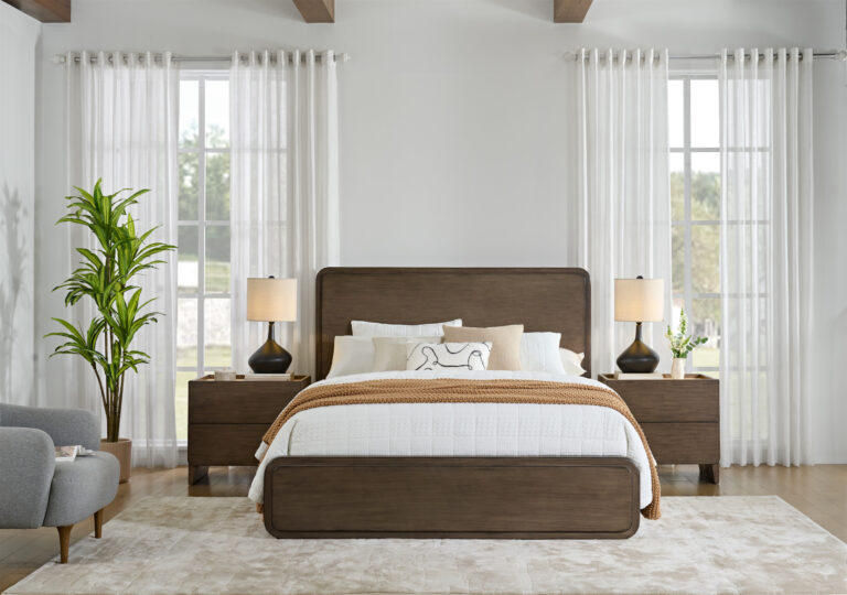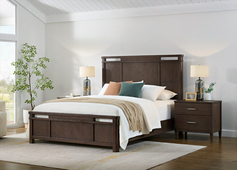 Crafted from solid Western Hemlock with Hemlock veneer over MDF, this bedroom set draws on the species’ workability and uniform grain to achieve crisp edges and a smooth, consistent surface across components, while a light wire-brushed finish and warm stain bring out its subtle texture. The open-panel frame of this collection introduces depth without added weight, and the gently tapered base maintains a calm, balanced presence.