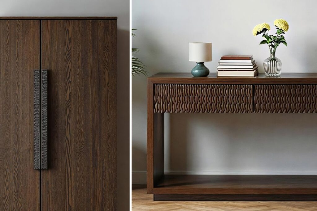 The console leans more into machined texture, driven by what CNC and production equipment can do efficiently. The armoire, on the other hand, showcases a more hand-worked feel. Together, they show a range—from artisanal to scalable—that manufacturers can relate to.